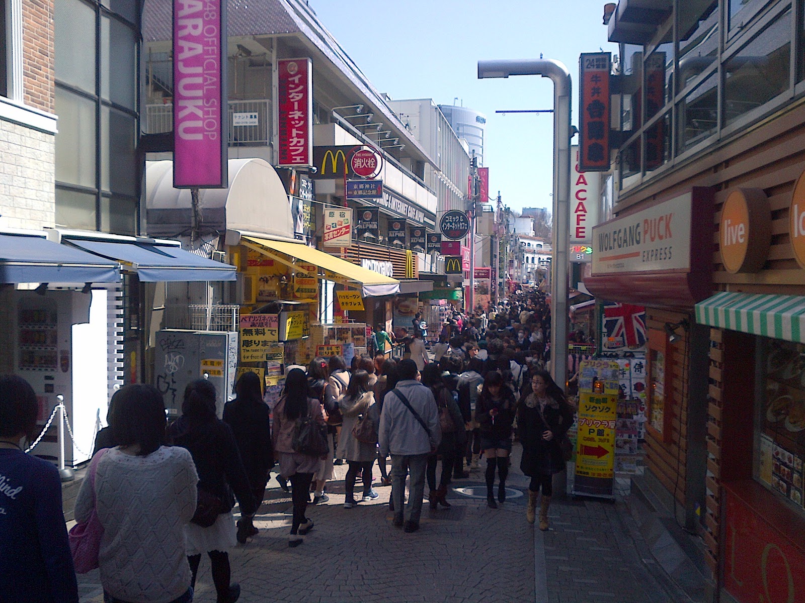 Em Tokyo, o ideal é sair lá pelas 10h00 da manhã, pois é o horário que a maioria das lojas abrem. Peguei o JR para Harajuku, o bairro dos “modernettes” de Tokyo. Saindo da estação, se desce a Takeshita St. que é lotada de gente, lojinhas, mulheres gritando como se fossem dubladoras de desenho animado, carrinhos de crêpe com fila, enfim, uma confusão.