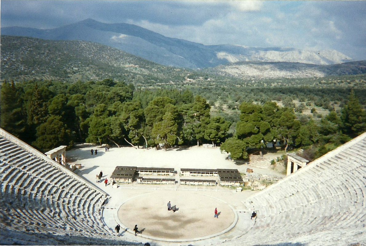 Depois fomos para Epidauro que é 30km de lá. É o teatro mais bem conservado e o segundo maior da antiguidade: 14.000 pessoas!! Até hoje fazem espetáculos. A acústica é a melhor que existe. Templo de Asclépio – deus da medicina, da cura e da terapia. Ele dizia que as pessoas adoeciam porque se desviavam de si mesmas, de sua verdade. Os doentes dormiam no cemitério – era o nome do lugar que eles dormiam esperando a cura.