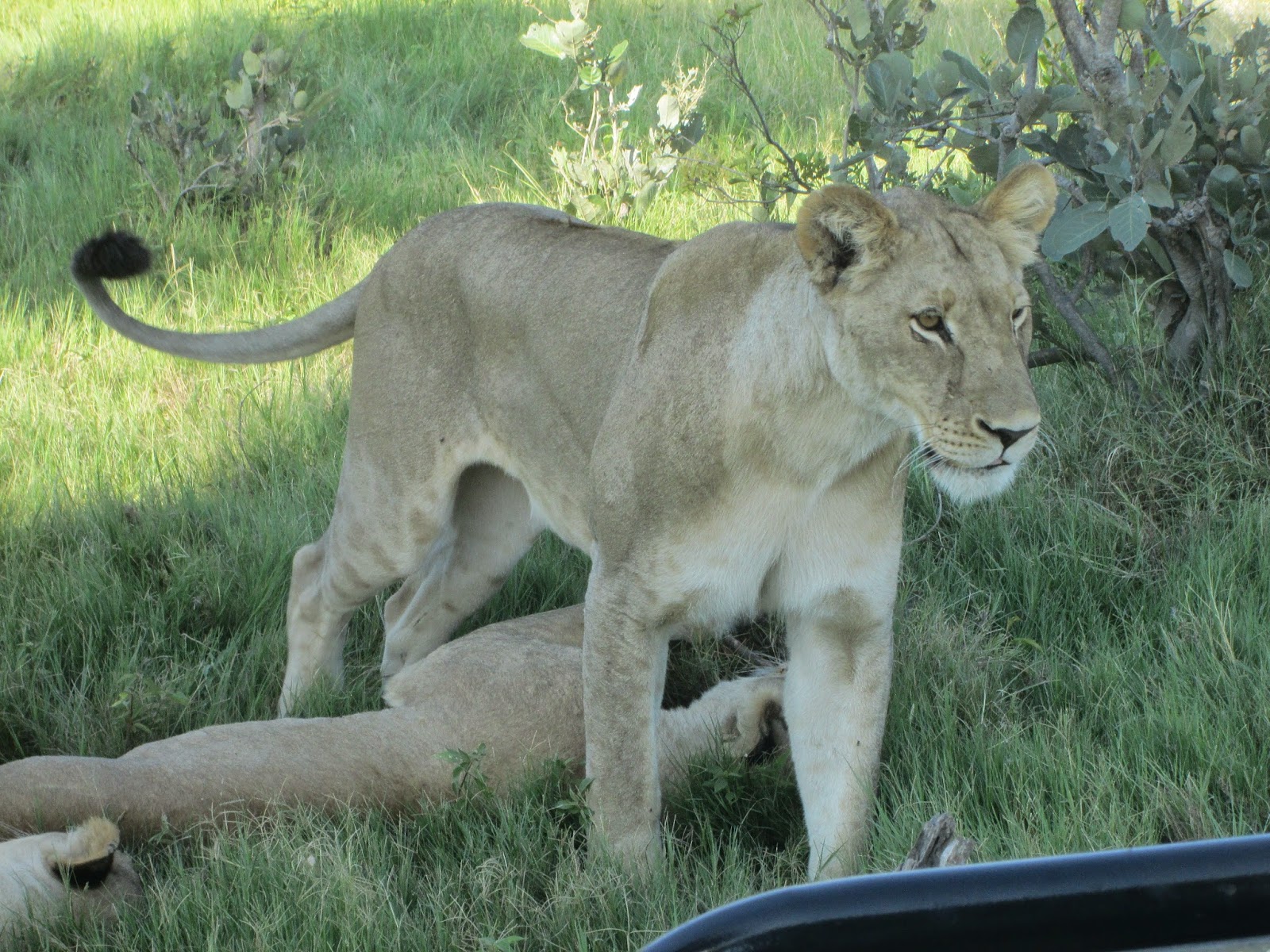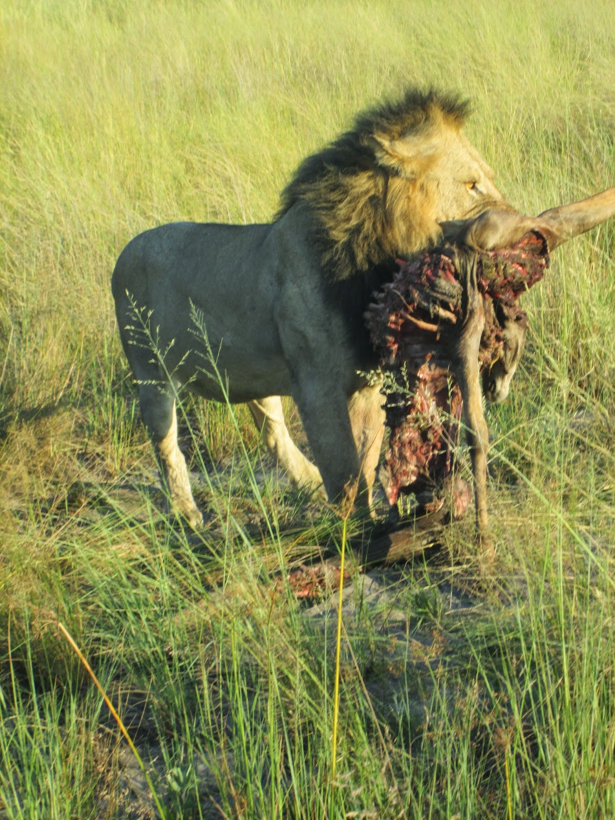 Nessa manhã vimos um leão protegendo sua presa, deveria tê-la matado horas antes, junto com uma leoa. Além de fotografar bem de perto, pudemos ver a interação entre macho e fêmea. Foi uma bela experiência, principalmente porque éramos os únicos a observar.