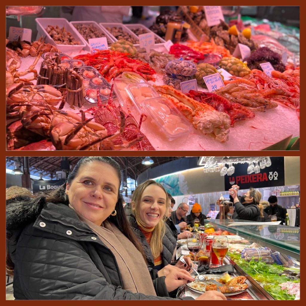 Fomos almoçar no Mercado de São José mercado local, popularmente conhecido como La Boqueria, o mais antigo dos mercados municipais de Barcelona, inaugurado em 19 de março de 1840 – dia de São José no calendário católico. Nele, se vendem frutas, carnes, artesanato, vinhos etc. Almoçamos no balcão de um restaurante ótimo! Tem vários restaurantes com balcão, onde se pode escolher o peixe, camarão, polvo ou lula sempre fresquinhos, são feitos na plancha na hora. O ambiente é muito bonito, colorido, cheio de vida com frutas e verduras de todo tipo. Vale a pena conhecer!