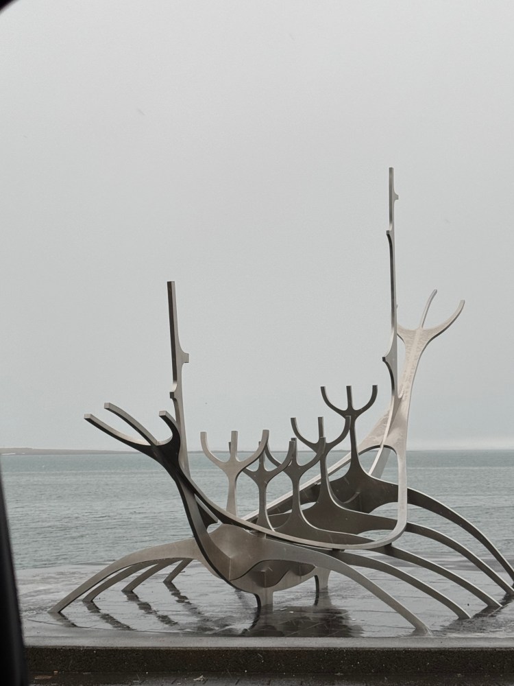 Descemos em direção a linda escultura Sun Voyager, um barco viking que representa o desejo de descobrir novas terras com esperanças de liberdade, do artista Jon Gunnar Arnason. Fica na principal marginal de Reykjavik, de frente para a maravilhosa montanha Esja ao lado da deslumbrante sala de concertos Harpa, toda de vidro, feita pelo famoso arquiteto Olafur Eliasson em 2008. Além de ser um ótimo arquiteto ele é artista plástico e faz exposições no mundo inteiro, Beijing, London, Stockolm, Veneza.