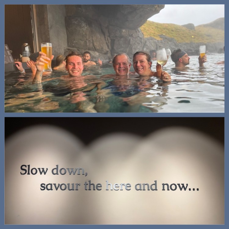 De lá fomos para a Sky Lagoon, uma experiência incrível! primeiro você toma banho numa grande piscina natural de águas quente de borda infinita junto ao mar, dentro dessa piscina tem um bar mais protegido do forte vento, onde se toma drinks, e do outro lado tem uma cachoeira que também entramos, deliciosa, bem forte.
