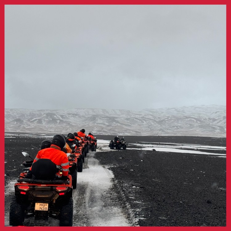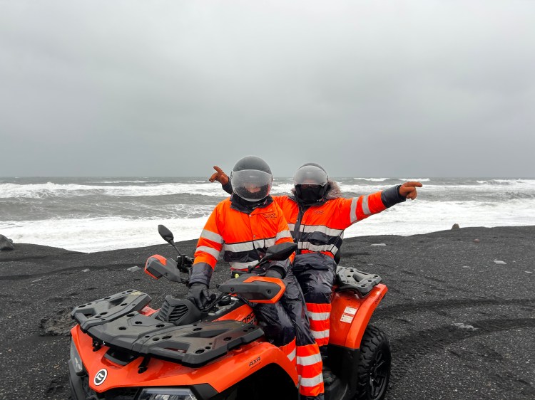 Passamos a noite no Hotel Rangá, em Hella, e relaxamos em uma hot tub ao ar livre sob a neve antes do jantar, delícia de programa!!! No dia seguinte fizemos um passeio de quadriciclo até a praia de areia preta, com uma paisagem vulcânica única. Parece que você está na lua!!! É muito impressionante!!