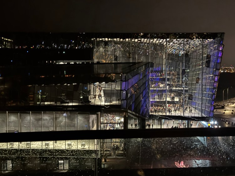 Depois subimos no bar no último andar, muito simpático, com música e com uma vista linda da cidade, inclusive da Harpa Concert Hall. Inaugurada em 2011, é a sede Opera de Reykjavik e parece uma colméia com sua arquitetura linda. Sua fachada é formada por hexágonos de vidro. Mesmo que você não vá assistir a nenhum concerto, vale a pena conhecer o belíssimo prédio moderno que contrasta com as construções ao seu redor. Está localizado próximo ao antigo porto à beira mar. e possui salas para reuniões, bares, restaurante, área para exposições, loja e, claro, a sala de concertos, recitais e conferências. Imperdível! Arquitetos:Henning Larsen Architects. Área construída: 28000 m²