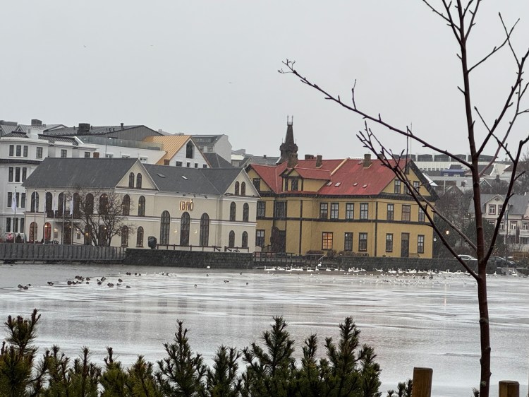Próxima parada foi o City Hall, de frente para o lago Tjornin, muito bonito com cisnes e patos. Passamos pela Laugavegur, rua principal cheia de lojas e bares, muito simpática.