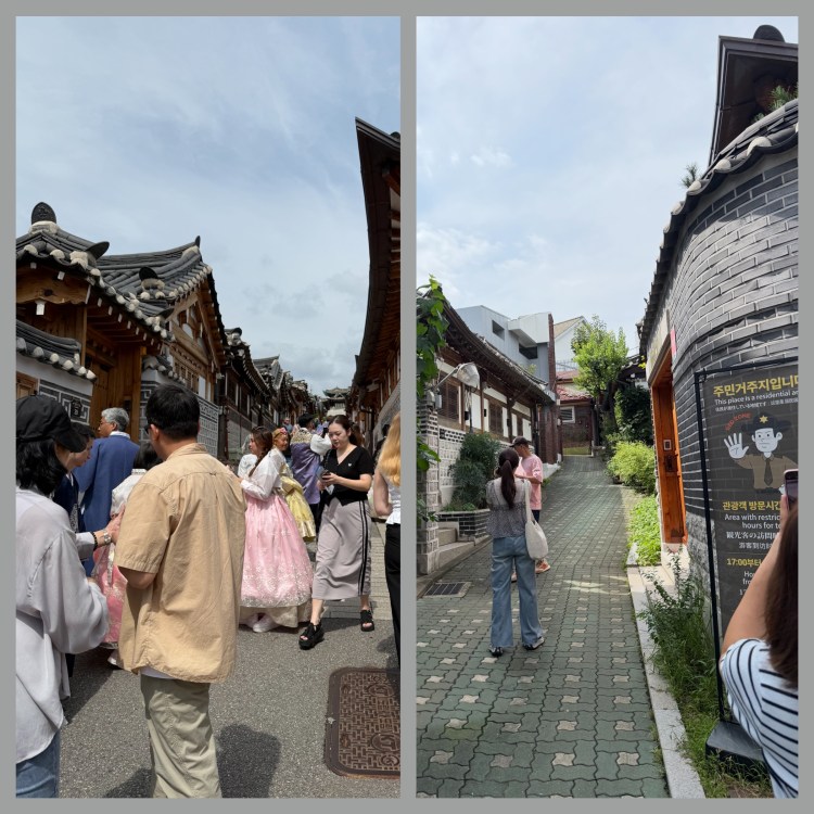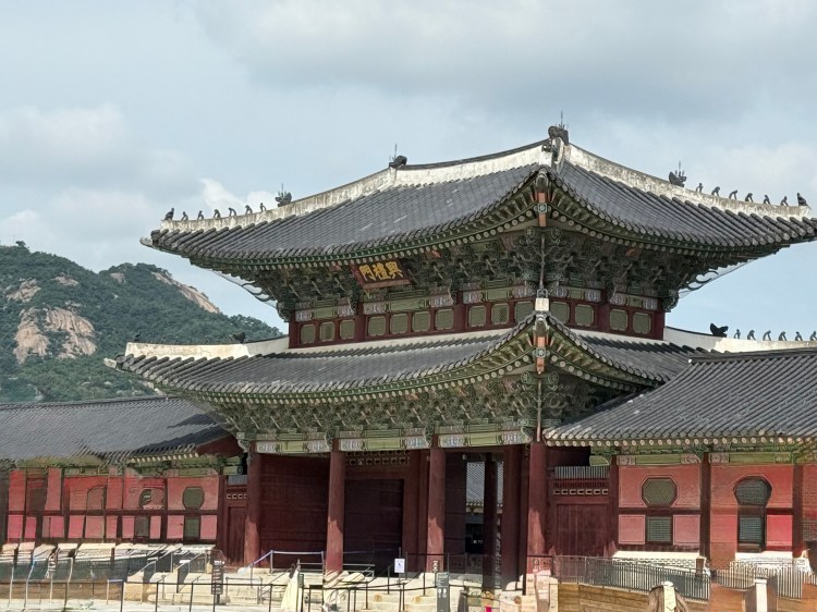 Seguimos então para o Palácio Gyeongbokgung, fundado em 1395 como sede da dinastia Joseon. Apesar de sua imponência, o acesso ao interior é bastante limitado, e boa parte das edificações originais foi destruída durante a ocupação japonesa — mais de 90% das estruturas foram demolidas ou removidas, deixando marcas profundas na identidade de Seul.