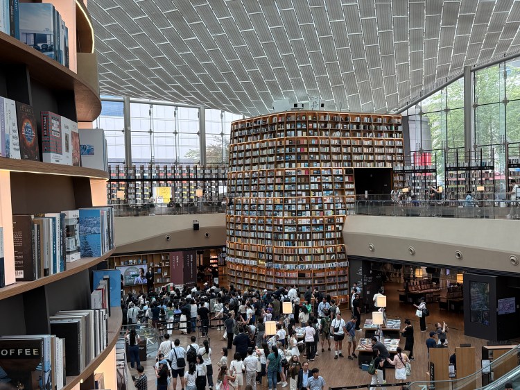 O espaço, imponente e luminoso, abriga estantes de até 13 metros de altura e um acervo de mais de 50 mil livros e revistas, tornando-se um dos pontos mais fotogênicos e inspiradores de Seul.