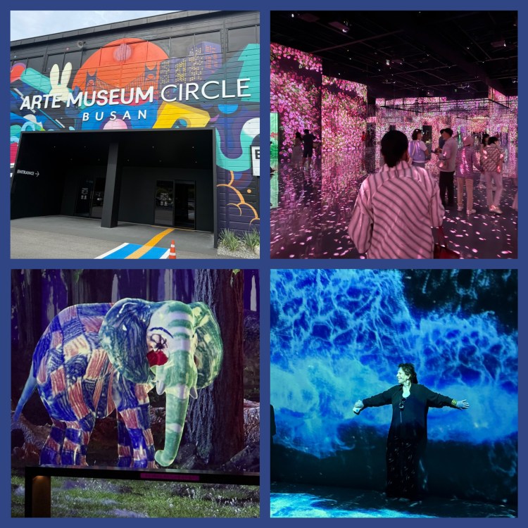 No dia seguinte fomos ao Busan Museum of Art, mais precisamente à instalação “Museum Circle”, uma experiência imersiva de projeções. As paredes e o chão se transformavam em telas que exibiam vídeos de flores, tempestades e ondas do mar, culminando em uma sequência com imagens de obras do Musée d’Orsay. O efeito era poético e envolvente, uma verdadeira viagem sensorial.