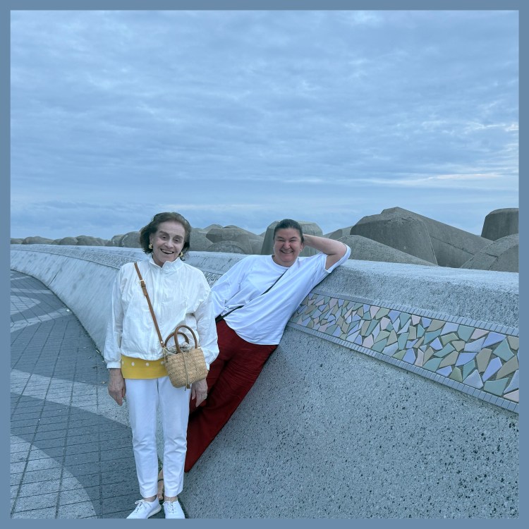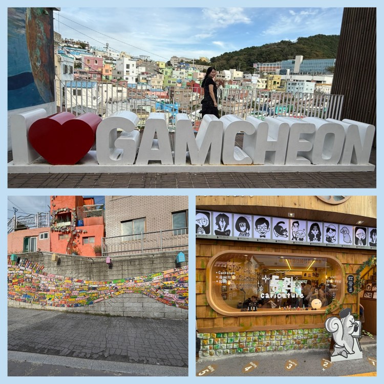Fomos visitar a Gamcheon Culture Village, conhecida como a “Santorini da Coreia”. O bairro é composto por casinhas coloridas que descem em labirintos de ladeiras, repletos de ateliês, cafés e lojinhas de cerâmica.