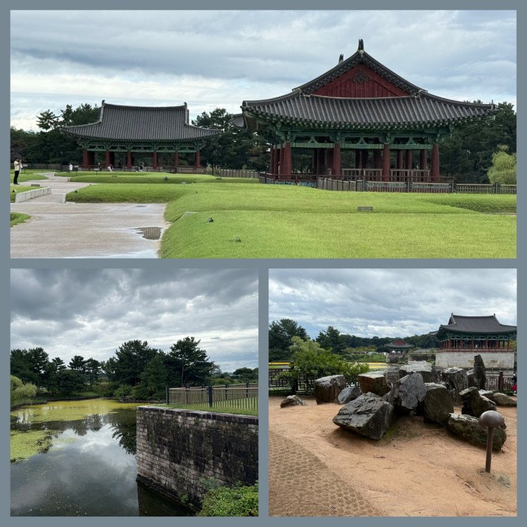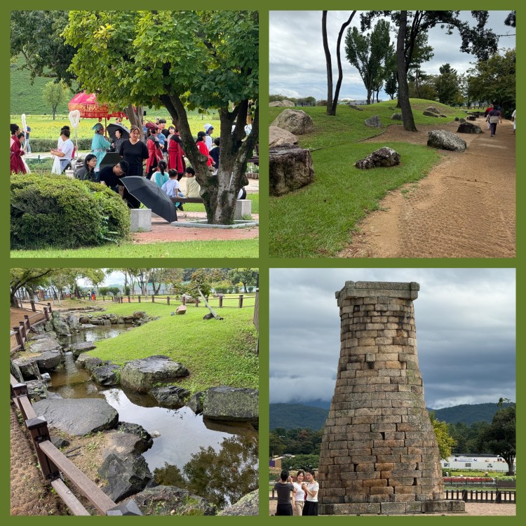 No dia seguinte fomos para a cidade histórica de Gyeongju, a cerca de uma hora de Busan, antiga capital do reino de Silla Kingdom, onde visitamos palácios do século VII localizados no meio de um parque amplo e belíssimo. Caminhar por ali foi uma experiência tranquila e espiritual — os túmulos reais, cobertos por grama e moldados como pequenas pirâmides arredondadas, guardam um legado fascinante.