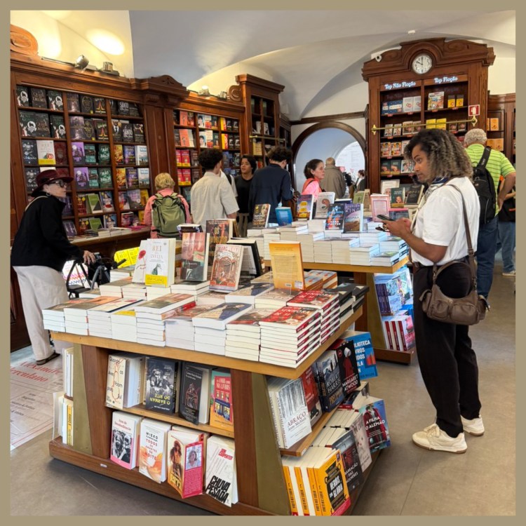 O café foi frequentado por nomes centrais da cultura portuguesa, como Fernando Pessoa que foi eternizado ainda pela sua estátua na porta do local, que transforma o café em parada obrigatória para quem deseja vivenciar a alma boêmia, literária e cosmopolita do Chiado. Após essa parada de lá caminhamos mais um pouco e seguimos até a Livraria Bertrand.