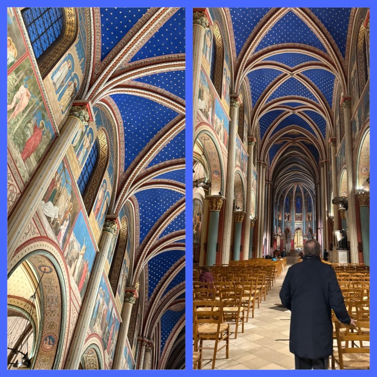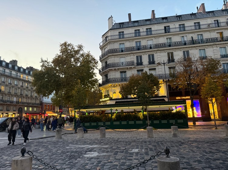 Em seguida, passeamos pelo bairro, aproveitando o clima agradável. Entramos na igreja de Saint-Germain-des-Prés para rezar, a mais antiga de Paris, originada de uma importante abadia beneditina fundada no século VI pelo rei Quildeberto I. Ao longo dos séculos, o complexo monástico tornou-se um centro religioso fundamental e deu origem ao próprio bairro. A igreja atual, remanescente da antiga abadia, preserva traços marcantes da arquitetura medieval e permanece como um testemunho histórico que sobreviveu a saques, transformações e reconstruções, mantendo viva sua ligação com a história da França e de Paris.