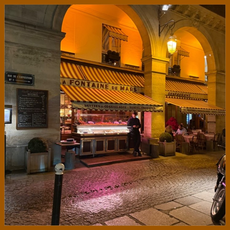 Jantamos no Fontaine de Mars, bistrô tradicional fundado no início do século XX, de atmosfera clássica e sem afetações, onde a cozinha francesa pode ser apreciada.